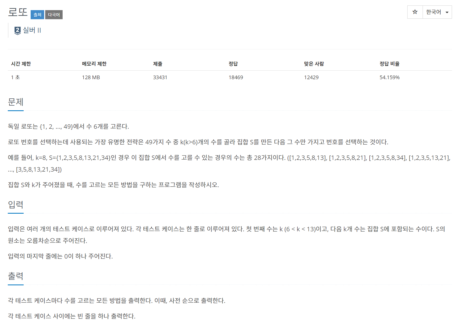 첫번째 재귀는 아무도 방문되지 않았기때문에 1,2,3,4,5,6 이 입력되어 6개를 충족하기 때문에 경우의 수를 출력해준다.